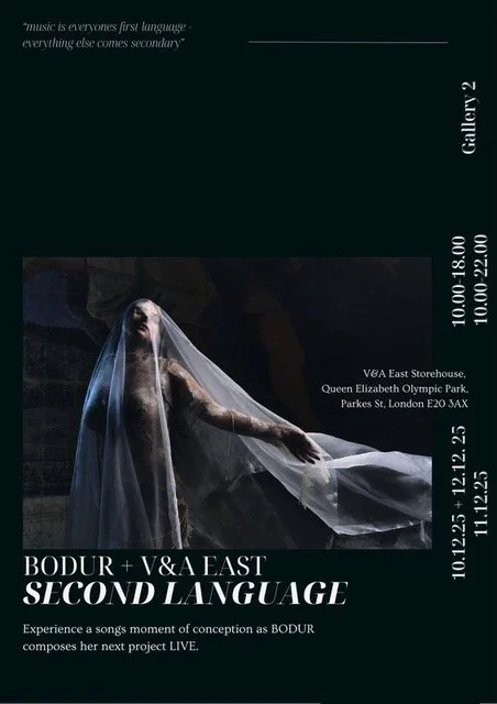 This month, BODUR turns toward process itself with SECOND LANGUAGE, a three-day live installation at V&A East Storehouse that runs from 10–12 December, with a final performance on Saturday, 13 December at 6pm. Across the installation, Gallery 2 becomes a functioning recording studio where BODUR will compose new music in real time with her long-term collaborators Malte Henning, James Hazel, Will Heaton, Jono Pamplin and producer Gabriel Gifford.