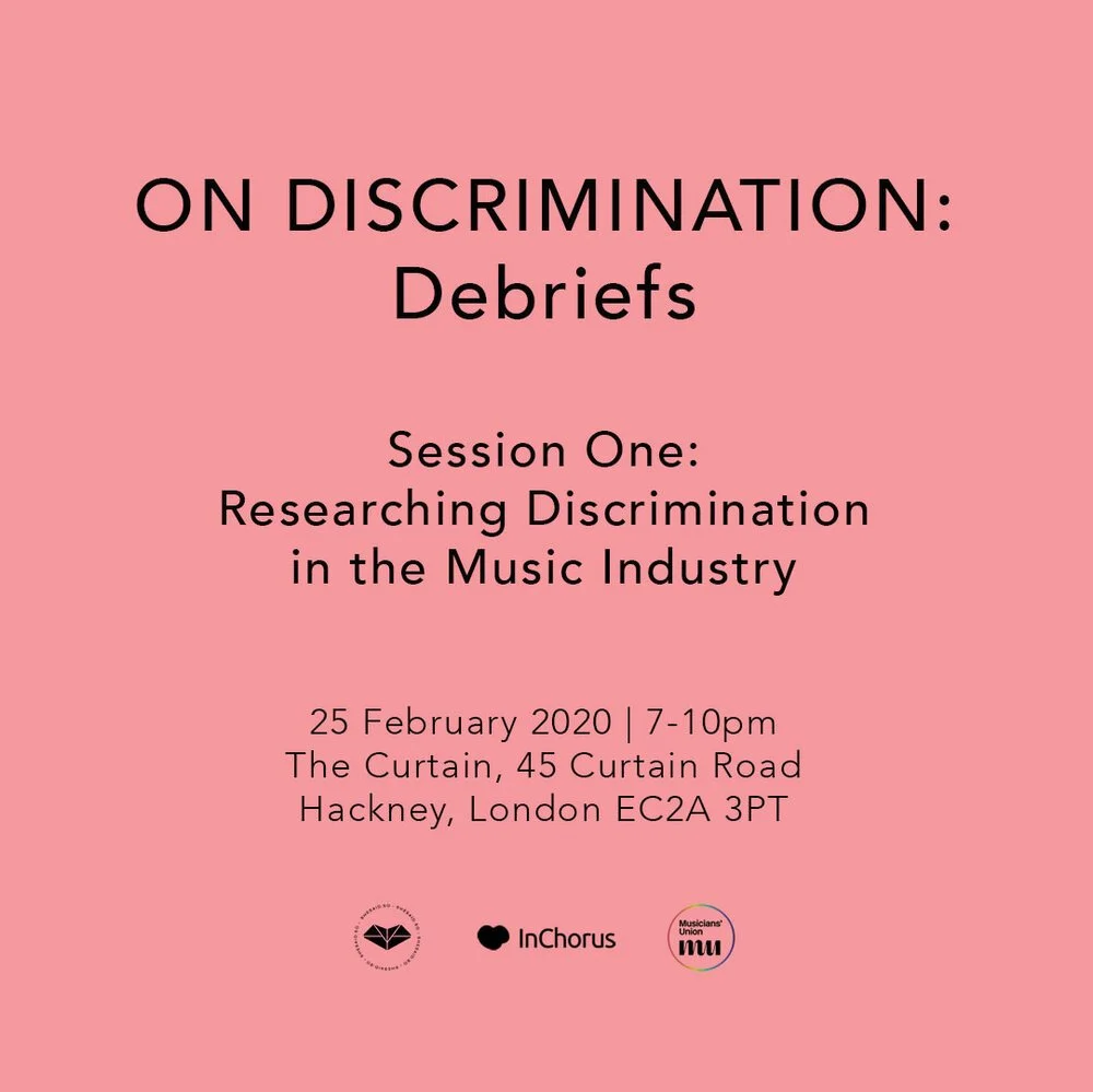 ON DISCRIMINATION: Debriefs, is a four-part series investigating bias, harassment and discrimination in the music industry. Session One: Researching bias, harassment and discrimination will involve a deep dive into the results captured by the above organisations’ surveys, followed by a roundtable discussion (to which contributions are welcome). Please note that this event is open to all genders.