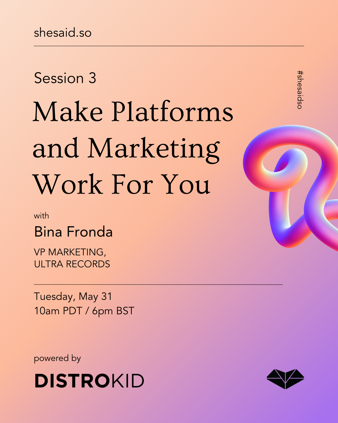 Session #3 continues with a focus on DSPs and marketing your music on them, led by Ultra Music Records VP of Marketing, Bina Fronda.