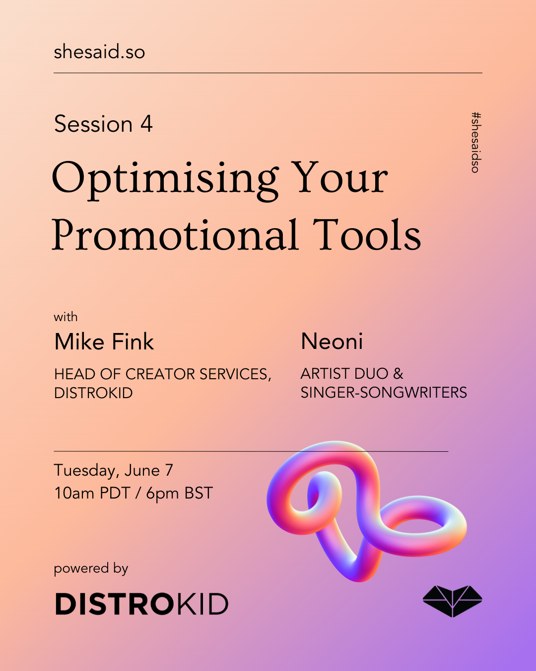 Session 4 wraps up our series with DistroKid’s Head of Creator Services, Mike Fink, who sits down with singer/songwriters and DistroKid artists, Neoni, to talk about their artist journey, putting together a promo strategy, tools that have helped them along the way, tips for other indie artists, and more.