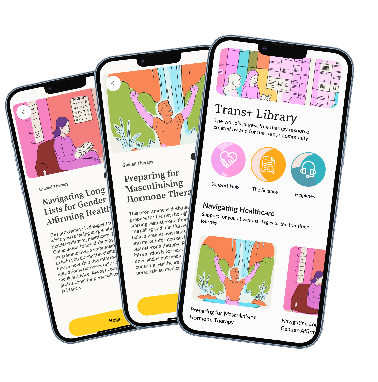 This library contains 52 self-led mental health programmes that address the most pressing issues for the trans+ community. Whether you're managing the emotional toll of waiting for gender-affirming care, or building resilience against transphobia, there is something designed to help you.